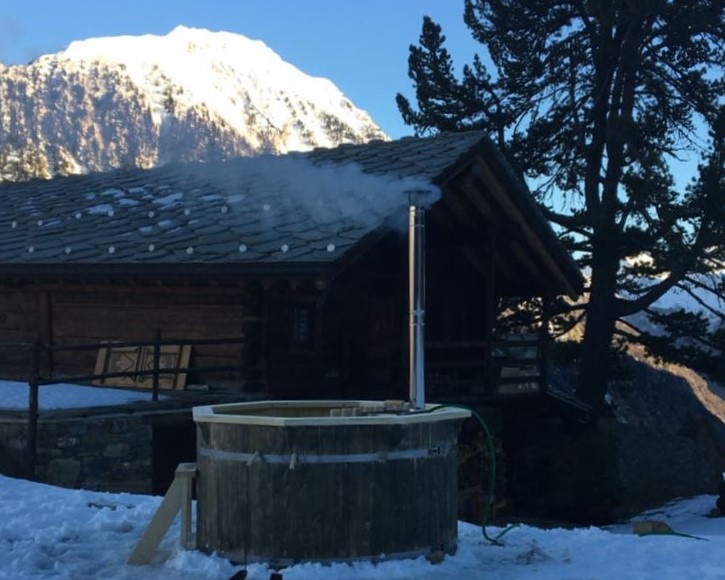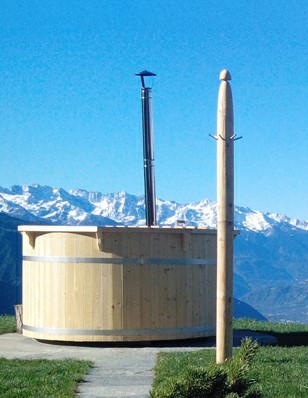 La stufa all”interno è in accaio inox ed è dotata di canali per il passaggio dell’acqua e di un camino rimovibile alto 2 metri. Durante il riempimento la stufa può essere accesa appena l’acqua raggiunge un livello di 20 cm. Il tempo necessario per riscaldare l’acqua alla temperatura raccomandata di 35-38° è di 1 ora ca. per ogni m3. All’acqua possono essere aggiunti sale marino, estratti di erbe oppure oli eterici.